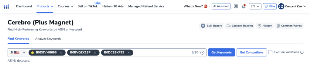 Helium 10’s Cerebro tool allows you to see exactly which keywords top competitors are ranking for.