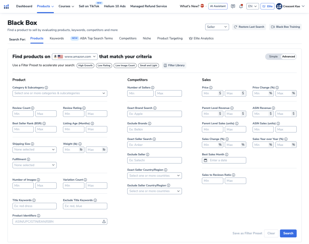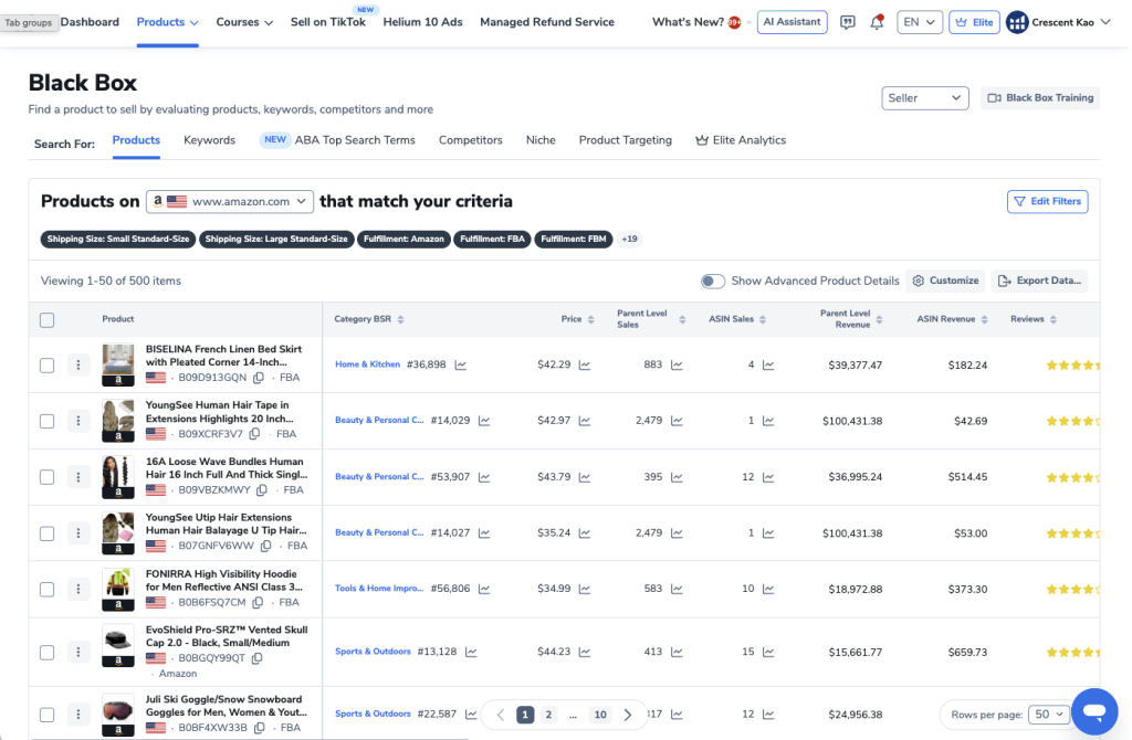 Blackbox is Helium 10’s flagship product research tool.