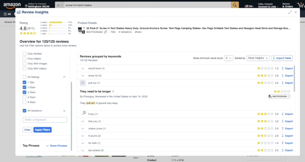 Helium 10’s Review Insights tool analyzes thousands of reviews and identifies common themes.