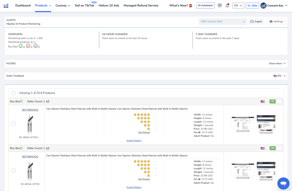 Helium 10 Alerts monitors your listings and notifies you if: